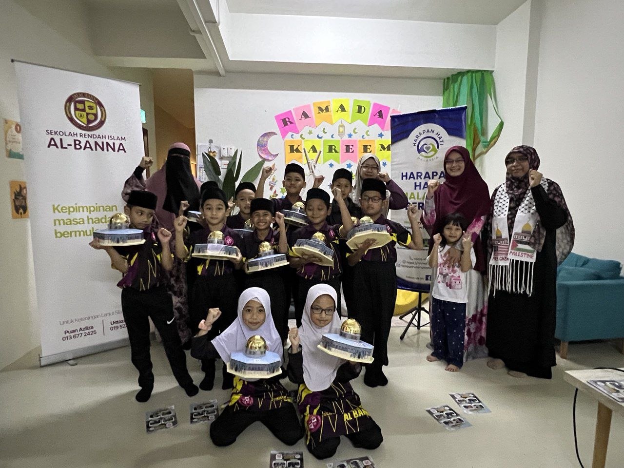 Harapan Hati Malaysia (HHM) meneruskan siri kedua kunjungan lapangan bagi memupuk kesedaran perjuangan pembebasan Al-Aqsa di Sekolah Rendah Islam Al-Banna, di sini hari ini. Program ini merupakan kesinambungan inisiatif HHM selepas menyantuni peringkat prasekolah sebelum ini. Walaupun bilangan murid yang hadir adalah seramai 12 orang memandangkan sesi persekolahan hampir ke cuti perayaan Aidilfitri, namun program tetap berlangsung dengan penglibatan aktif melalui sesi soal jawab mengenai sejarah dan perjuangan rakyat Palestin. Program dimeriahkan dengan slot kuiz spontan bagi meninjau pengetahuan pelajar, di mana rata-rata murid memberikan jawapan yang baik hasil pendedahan daripada ibu bapa dan media massa. Sebagai galakan, murid yang berjaya menjawab telah dihadiahkan penanda buku (bookmark) bertemakan Ramadan. Selepas laungan doa Qunut Nazilah yang disampaikan dengan penuh semangat, pihak HHM mengadakan sesi penyerahan hadiah berupa Tabung Harapan Palestin kepada setiap murid dan guru bagi memulakan amalan menabung untuk Palestin di rumah. Sebagai kemuncak program, warga Sekolah Rendah Islam Al-Banna telah menyerahkan sumbangan tunai yang dikumpul lebih awal di sekolah untuk disalurkan terus bagi membantu rakyat Gaza melalui wakil HHM. Kunjungan diakhiri dengan sesi fotografi bersama dan laungan takbir, melambangkan solidariti serta sokongan padu murid-murid Sekolah Rendah Islam Al-Banna terhadap perjuangan Palestin.